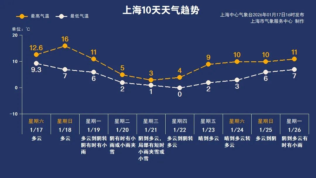 下周三夜里起,上海雨雪渐止转阴到多云,下半周将以晴冷天气为主,体感由湿冷转为干冷。未来十天,上海气温起伏较大,大家要及时增添衣物,谨防感冒。