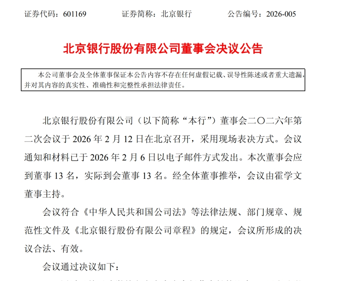 2月13日,北京银行发布董事会决议公告,会议通过《关于选举关文杰先生为本行董事长的议案》,同意选举关文杰担任北京银行董事长,其任职资格尚需监管机构核准。同时同意霍学文辞去北京银行董事长、董事会战略与社会责任(ESG)委员会主任委员、董事会消费者权益保护委员会主任委员职务。通过《关于聘任魏昱先生为本行副行长的议案》,同意聘任魏昱为北京银行副行长,其任职资格尚需取得监管机构核准。