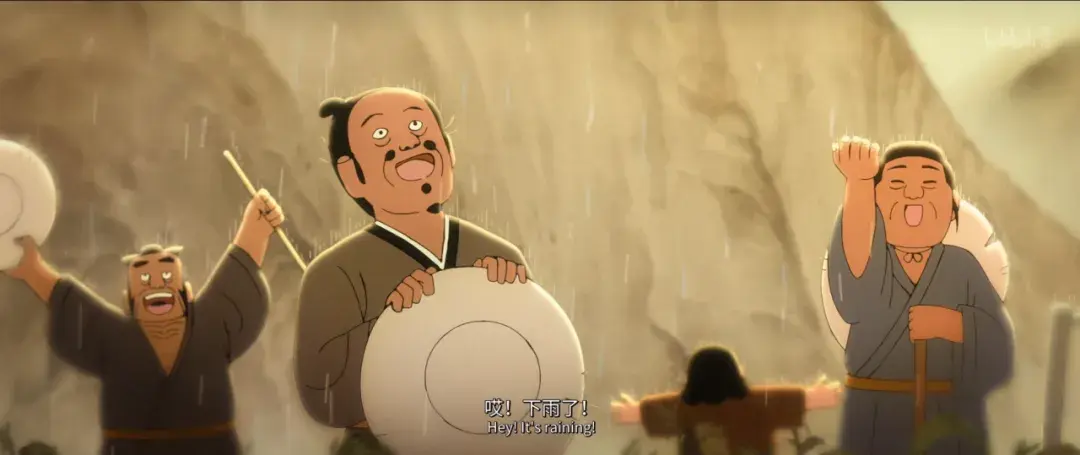 回到剧情,在三兄弟的一系列尝试后,它们终于找到解法:通过二弟胖蛇妖喝下大量的水,再像喷泉一样精准地喷洒到田里,干旱的土地终于得到滋润,庄稼也开始返青。