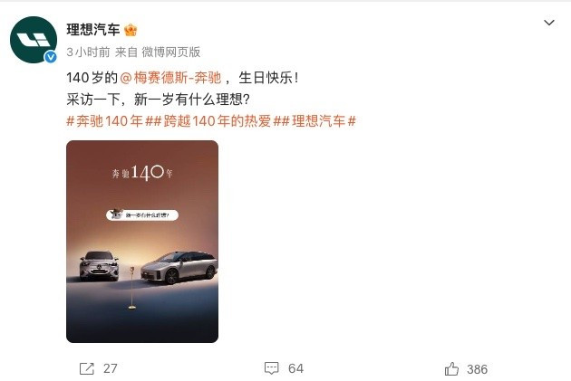 与此同时,小米汽车官方也发布祝福文案,明确表示“奔驰140年,就是汽车工业的140年。小米汽车祝奔驰140岁生日快乐。向先行者致敬,有幸与君同行”。