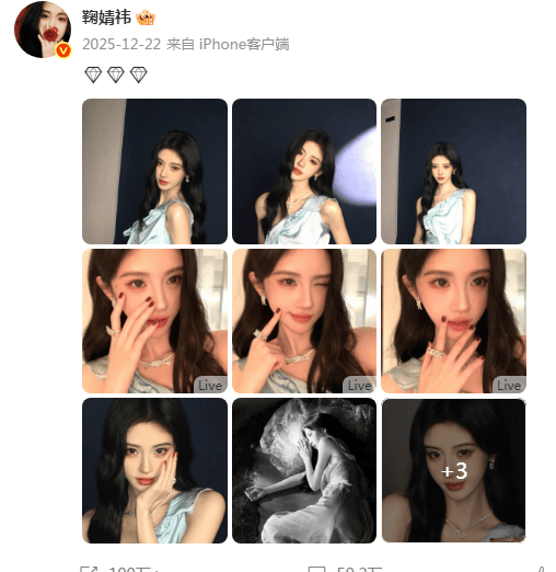 最近,鞠婧祎自2025年12月22日发布星光大赏相关动态后,微博已持续断更超过半个月,跨年及元旦均未营业,引发粉丝担忧和业内猜测。