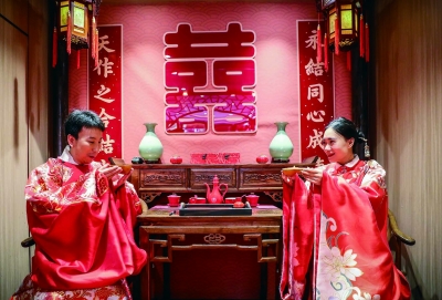 新人在秦淮区民政局婚姻登记处夫子庙婚姻登记点(喜福馆)沉浸式体验传统婚俗文化。 实习生 冯家瑢 南京日报/紫金山新闻记者 董家训 摄