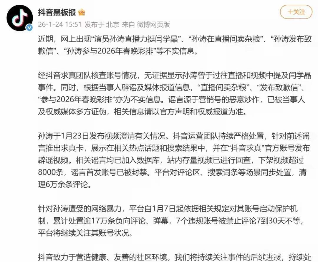 删帖?不过是欲盖弥彰,反而坐实了她心虚的事实。要知道,网络不是删了就没痕迹,传播链清晰、证据确凿,她的每一步操作,都被看在眼里,记在心里。更解气的是,平台这次没手软,直接重拳出手——不仅下架了相关谣言视频超8000条,清理带节奏评论6万余条,还直接封禁了这位大妈的账号,连带一批跟风造谣的小号也被处理,同时为孙涛的账号启动了保护机制。一句轻飘飘的造谣,让孙涛承受了20多天的网暴,家人也受牵连;而这位网红大妈,只是为了蹭一波热度,博一波流量,就张口就来,无视事实,把造谣当流量密码。可她忘了,流量从来不是无底线的遮羞布,网络也不是法外之地,造谣的代价,终究要自己扛。如今,孙涛的律师团队已经掌握了完整证据,后续将依法追责。这位大妈就算删了帖,就算账号被封,也躲不开该承担的责任——为自己的口无遮拦,为自己的流量至上,付出应有的代价。
